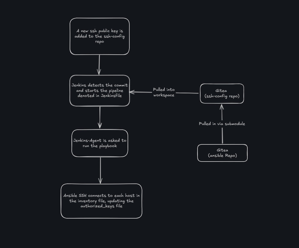 authorized_keysfile stored in thessh-configrepo on Gitea - Jenkins detects this commit, and begins running the pipeline as defined by
