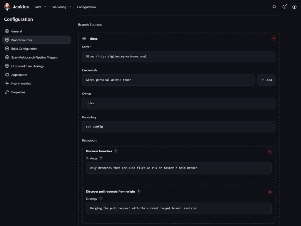 Jenkins is a CI/CD tool that can run jobs automatically, and triggered by commits in a Git repository. What’s nice about this is that we can point Jenkins to the local Gitea instance and specifically my ssh-config repository. When a commit is made to this repo’s primary branch, it will automatically trigger the Jenkins pipeline to run the commands specified in the Jenkinsfile located in the repo, itself being version controlled (and therefore easy to update and maintain).
